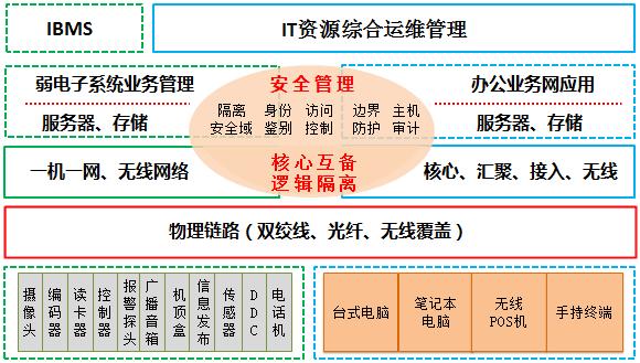 一機一網的智簡架構,弱電系統IP網和辦公業務網各自組網,核心交換機互聯互通互為冗余備份,通過訪問控制策略實現安全域之間的安全隔離。